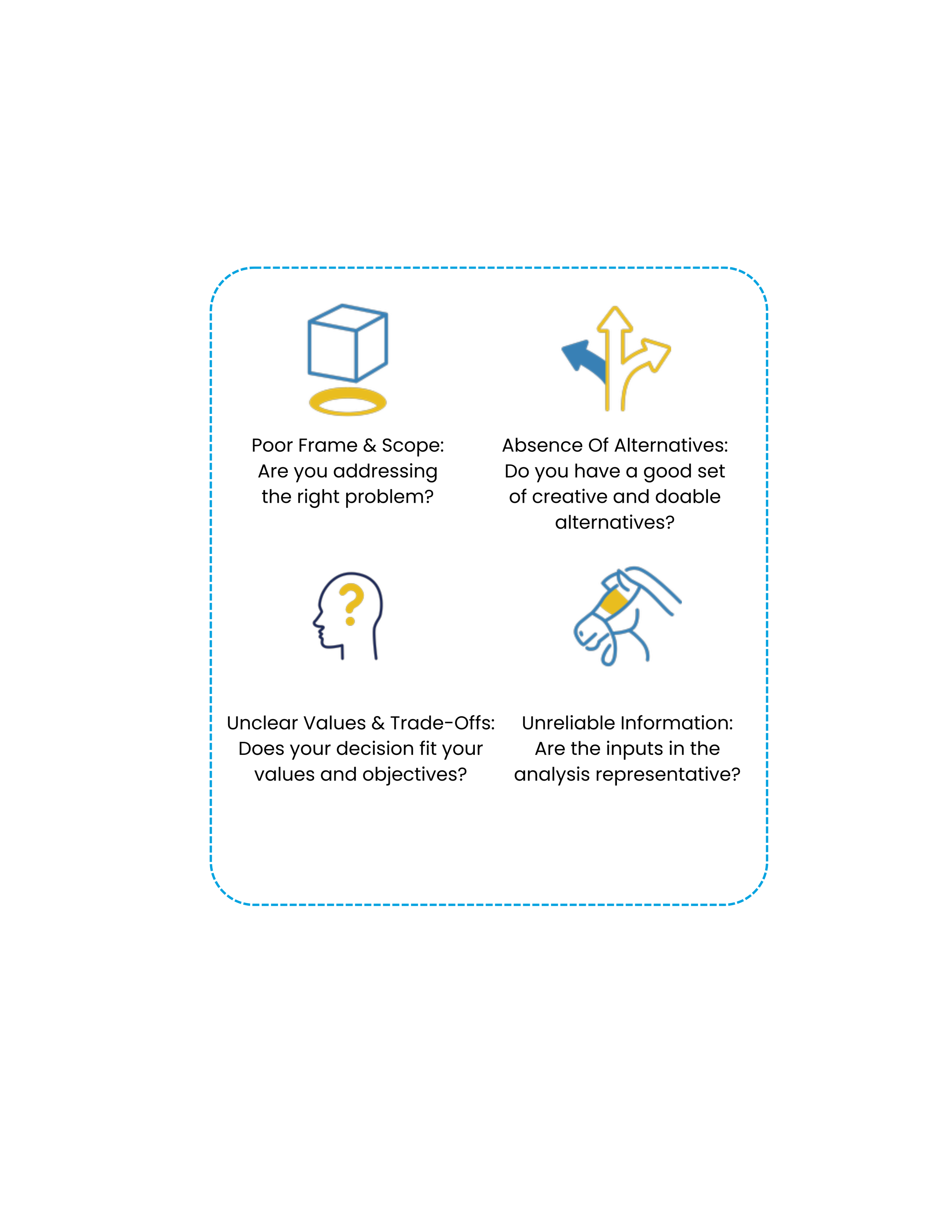 The road to a strong decision is full of pitfalls. Stakeholders with conflicting priorities, limited solution space, or unreliable data can undermine the process. The Seven Deadly Sins of Decision Making highlight the most common shortcomings that cause decisions to collapse under strain.